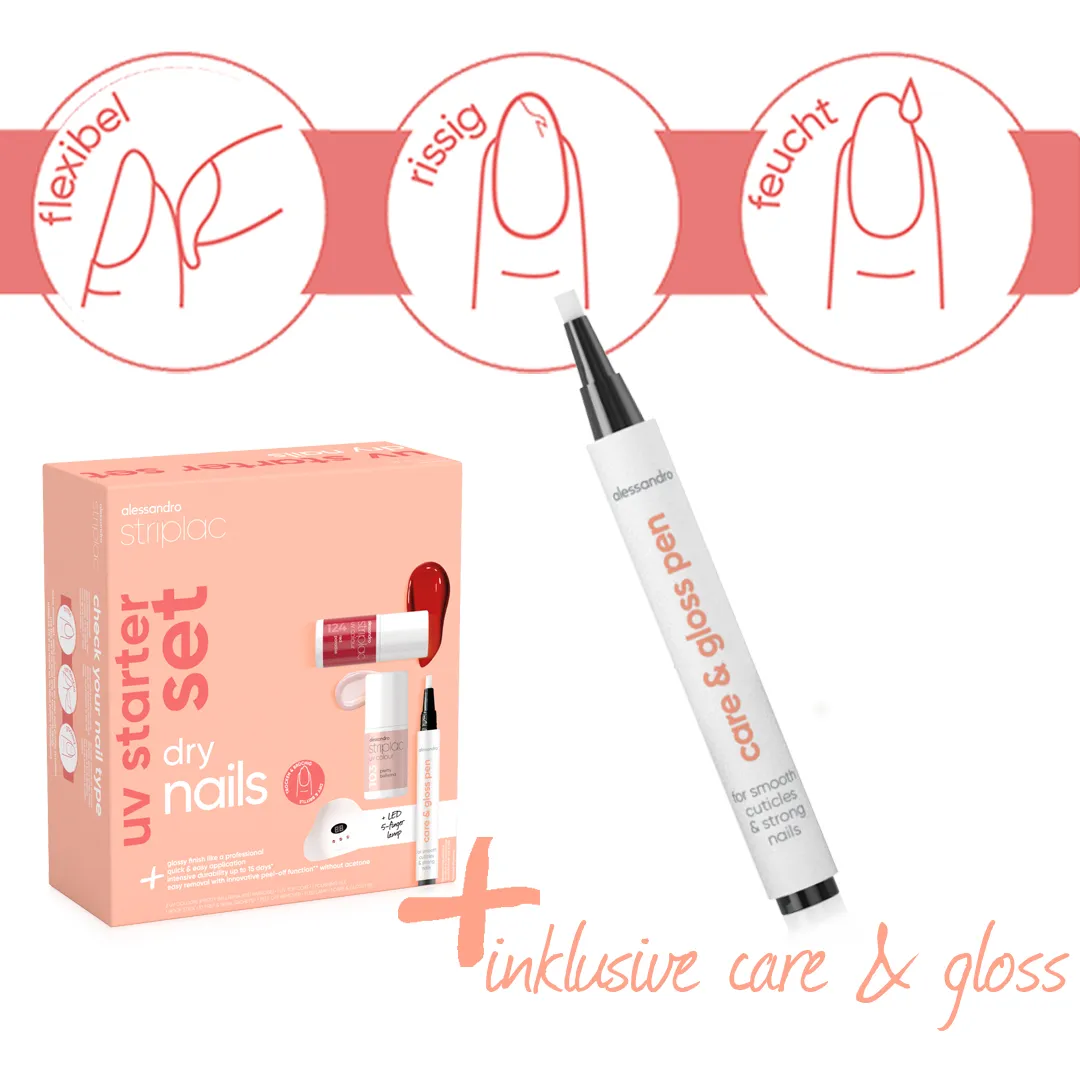 Start your Striplac Routine.Verschiedene Nägel haben unterschiedliche Bedürfnisse. Finde deinen Nageltyp, um das optimale Starter Set und Produkte für deine Nagel Routine zu wählen. Das Starter Set Dry Nails enthält perfekt aufeinander abgestimmte Essentials für deinen Nageltyp. Der enthaltene Care & Gloss Pen versorgt trockene Nägel mit einer extra Portion Pflege und verleiht den Nägeln abschließend einen zusätzlichen Glanz. Hinweis: Beim ersten Gebrauch den Knopf des Care & Gloss Pens mehrmals (bis zu 20-mal) drücken, bis das Öl in der Spitze sichtbar wird. Trockene Nägel zeichnen sich meist dadurch aus, dass sie brüchig, fest oder rillig sind.Inhalt:1x Pretty Ballerina 6,5ml1x Red Paradise 6,5ml1x Top Coat 6,5ml10x Prep & Shine Sachets1x Peel Off Remover 6,5ml1x Polishing File1x Hoof Stick1x LED Lichtgerät 5 Finger inkl. Anleitung1x Care & Gloss PenHinweis:Damit dein Lichtgerät zuverlässig funktioniert, verwende bitte einen Adapter mit 5V / 2A. Die Angaben zur Leistung findest du in der Regel direkt auf dem Adapter – entweder als Aufkleber oder eingeprägt ins Gehäuse. Achte auf den Hinweis „Output“ oder „Ausgang“. Dort sind Spannung (V) und Stromstärke (A) angegeben, z. B.: Output: 5V – 2AWichtig: Dein Adapter muss 5V und mindestens 2A liefern.• Ein höherer Ampere-Wert ist unproblematisch – dein Gerät zieht nur so viel, wie es benötigt.• Ein niedrigerer Wert hingegen kann dazu führen, dass dein Lichtgerät nicht richtig funktioniert.