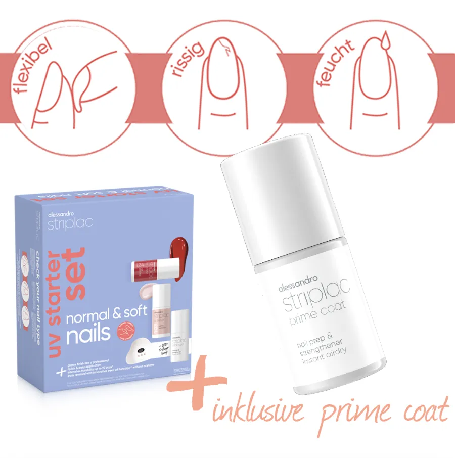 Der enthaltene Prime Coat ist perfekt geeignet für normale und weiche Nägel und verbessert die Haltbarkeit unserer Striplac Farben.